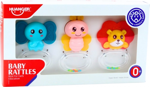 De rammelaars hebben levendige, aantrekkelijke kleuren die de aandacht van de baby trekken, en de gekleurde balletjes binnenin maken zachte geluidjes bij het schudden. De set is verpakt in een transparant doosje, wat het een geweldig kraamcadeau maakt.