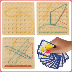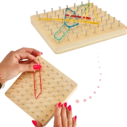 Ontdek een leuke manier om kinderen kennis te laten maken met de basis van de wiskunde – vormen, hoeken en symmetrie. Op de houten plaat met een dicht raster van pinnetjes spannen kinderen elastiekjes in verschillende lengtes en kleuren en maken ze figuren volgens de kaarten of hun eigen fantasie. Het spel versterkt de oog-handcoördinatie, concentratie en logisch denken.