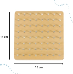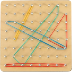 De plaat is gemaakt van glad geschuurd hout zonder scherpe randen. De metalen pinnetjes hebben afgeronde uiteinden die beschermen tegen krassen en helpen de elastiekjes op hun plaats te houden. Dankzij het compacte formaat is het geobord geschikt voor thuis en onderweg.