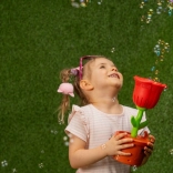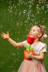 Deze bubbelmachine in de vorm van een rode roos in een bloempot zal alle kinderen verrukken die van bewegen en buitenspelen houden. Giet de vloeistof erin, zet aan en kijk hoe talloze glinsterende belletjes om je heen zweven. De LED-achtergrondverlichting geeft de bellen een bijzondere uitstraling, vooral in de schemering en ’s avonds.