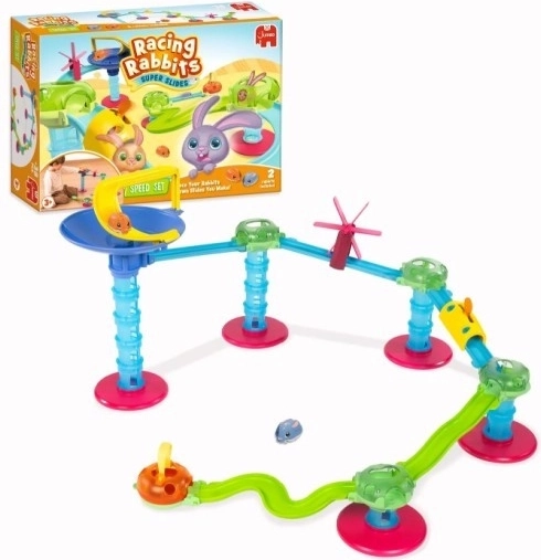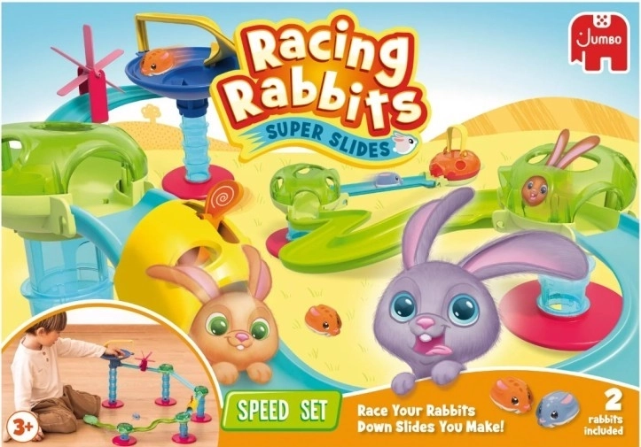 Bouw een glijbaan met de Speed-set en laat de konijntjes rennen! Plaats een van de twee schattige konijntjes bovenaan de trechter en kijk aandachtig hoe hij naar beneden glijdt!