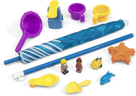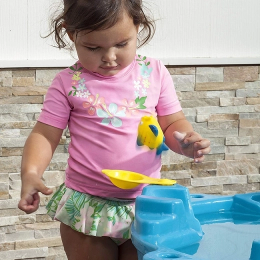 Deze tafel bevat veel speelaccessoires, waaronder een zeef, springplanken voor in het water, drie bekers, vier figuren en een water spinner in de vorm van een zeester. Het bovenste waterreservoir heeft een inhoud van 7,57 liter en het onderste 11,30 liter. Het productontwerp zorgt voor eenvoudige montage en stabiliteit.