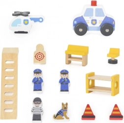 De set bevat figuren van agenten, een dief en een hond, plus een politieauto, helikopter, pionnen en accessoires voor actie-inzet.