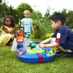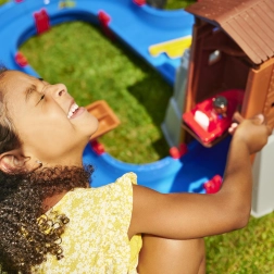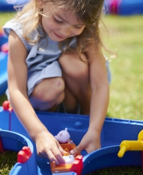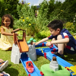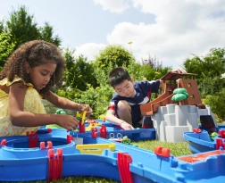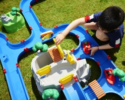 De waterbaan "Aquaplay" van het gerenommeerde merk BIG is een echt centrum van leren en plezier. Hij bevat 57 onderdelen die samen een uitgebreide waterset vormen – kanalen, sluis, waterkanon, katapult en een slinger om waterstromen te creëren. Kinderen kunnen het gedrag van waterstromen verkennen en observeren en leren hoe de sluis de waterstroom reguleert.