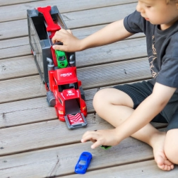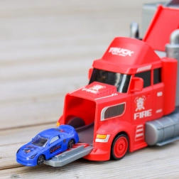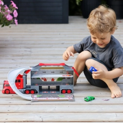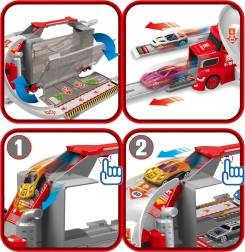Deze multifunctionele truck in aantrekkelijk brandweerdesign dient als trekker voor vervoer en verandert uitgeklapt in een complete speelset met garage, parkeerplaatsen en een dynamische baan. Dankzij de auto-launcher starten kinderen binnen een seconde met racen.