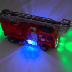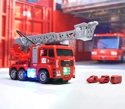 Interactieve brandweerauto voor jonge liefhebbers van reddingsvoertuigen. Gedetailleerd speelgoed met uitschuifbare ladder en waterkanon, dat een echte brandweerwagen simuleert.