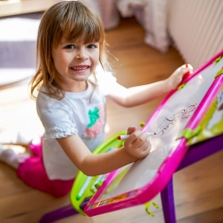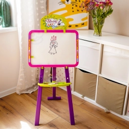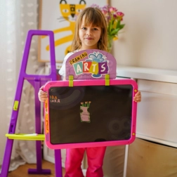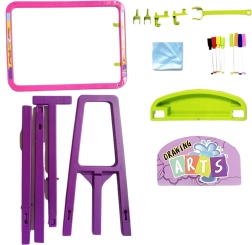 De lichte en stabiele constructie met een plankje voor accessoires houdt alles netjes bij de hand. Het bord is geschikt vanaf 3 jaar en helpt creativiteit, oog-handcoördinatie en samenwerking bij gezamenlijk knutselen te ontwikkelen. De fluorescerende functie wordt gevoed door AAA-batterijen.