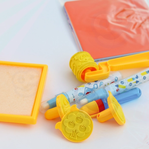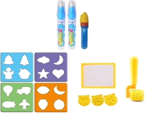 De set bevat waterstiften, stempels, een rollertje, sjablonen en een waterbakje, zodat tekeningen gevarieerder worden en het leren van cijfers en letters leuker is.