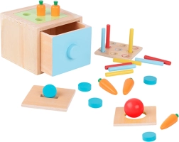 - - Bevat 26 stuks: lade, 4 sorteerinzetten, 1 rode bal, 5 munten, 5 wortels, 9 stokjes in drie kleuren