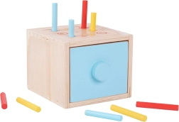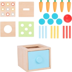 Werkt volgens het principe van het inwerpen van voorwerpen in de juiste openingen. Eenvoudig en toch educatief plezier waarbij kinderen vreugde en uitdagingen ervaren. De set bevat vier moeilijkheidsniveaus: