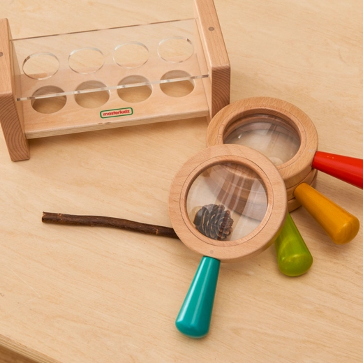 Houten kinderloep met standaard. Vier loepen met gekleurde handgrepen voor kinderen om te ontdekken.