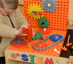 De set met gekleurde tandwielen en wieltjes maakt de constructie van complexe mechanismen mogelijk. Spelen met Masterkidz STEM-schroeven verbetert de motoriek, het logisch denken en de creativiteit van kinderen.