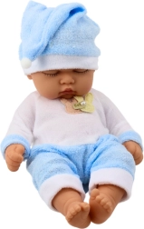 De pop heeft een compact formaat van ongeveer 24 x 12 cm, perfect voor kinderhandjes. Het pyjamaatje is van zacht materiaal in een mooie blauwe kleur en wordt aangevuld met een schattig mutsje met pompon. Een kleine print op het shirt met een fopspeenmotief geeft de pop een subtiele, kinderlijke charme.