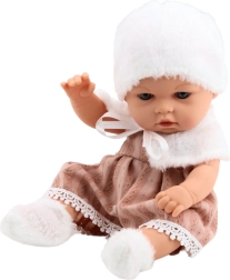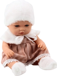 De babypop is gekleed in een beige jurk met geborduurde textuur en kant, aangevuld met een witte bontkraag en een zachte muts die onder de kin gestrikt wordt. De look wordt compleet gemaakt met bontsokjes, die de pop een knusse winterse uitstraling geven.