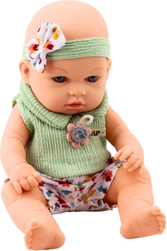 Babypop in groene outfit met bloemenpatroon en haarband met strik
