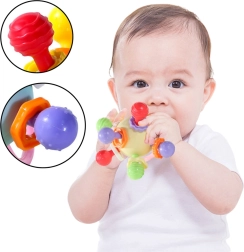 De ingebouwde rammelaar klinkt zacht bij beweging, wat de gehoorontwikkeling stimuleert en de aandacht van het kind trekt. Het compacte formaat en de handgrepen die geschikt zijn voor kleine handjes zorgen voor eenvoudig vastpakken, draaien en knijpen, waardoor de coördinatie en grijpkracht worden getraind.