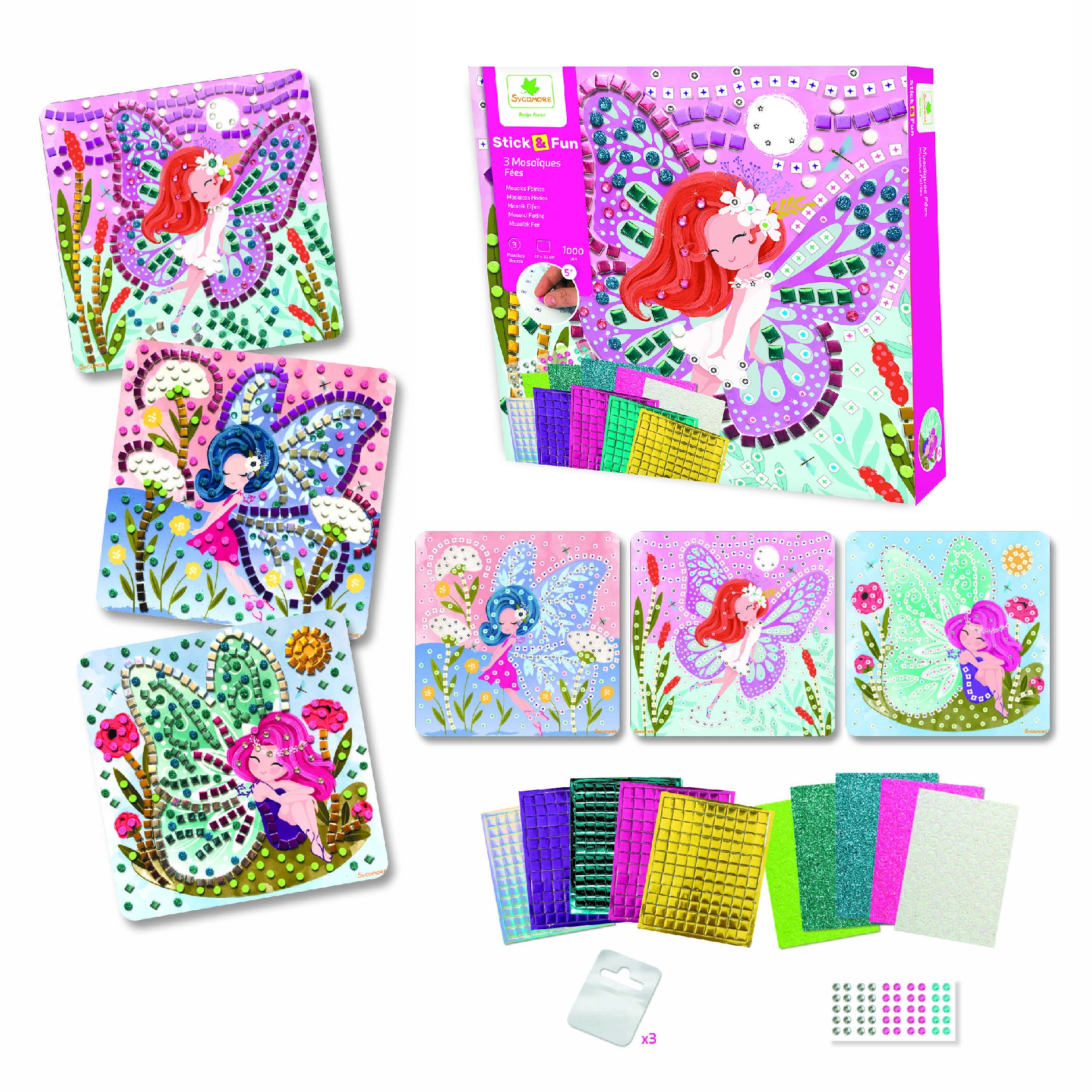 Kinderen zullen enthousiast zijn wanneer ze hun eigen prachtige mozaïekkunstwerken met feeën kunnen maken. Met behulp van zelfklevende steentjes en glinsterende mozaïektegeltjes werken ze elk plaatje af, dat vervolgens straalt met een unieke glans. Na afloop kunnen de kinderen de kunstwerken trots tentoonstellen met de meegeleverde transparante hangers.