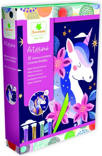 De creatieve set Glitter Zandschilderen Eenhoorns in de Nacht biedt een magische ervaring van creëren met glitters: