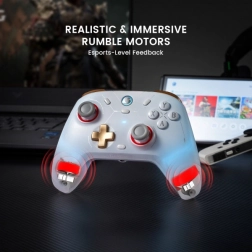 Dankzij de drievoudige connectiviteit (2,4 GHz, Bluetooth, kabel) kies je eenvoudig de ideale speelmethode met minimale latentie. De 6-assige gyroscoop ondersteunt motion‑bediening op SWITCH, asymmetrische vibratiemotoren bieden realistische feedback en e‑sports frontknoppen met microswitches garanderen snelle, zekere inputs. Aanpasbare RGB‑effecten en snel profielwisselen geven je spel zowel stijl als flexibiliteit.