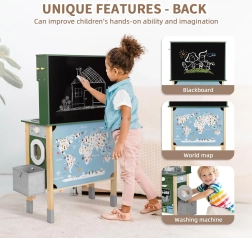 - 9-in-1 speelcentrum: koken, bakken, afwassen, wassen, tekenen, leren en afval scheiden.