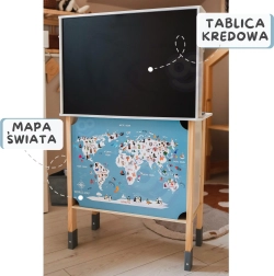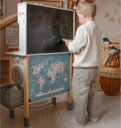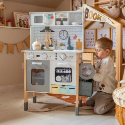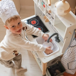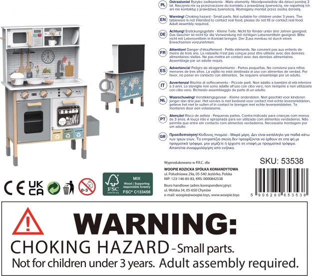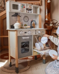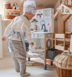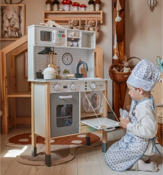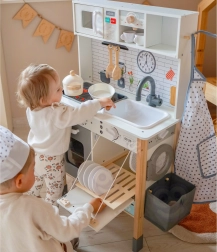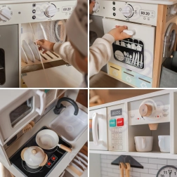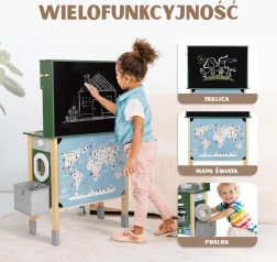 Deze houten WOOPIE GREEN keuken is ontworpen voor kleine chef-koks en ontdekkers. De voorzijde biedt een rijk uitgeruste culinaire zone met een koffiezetapparaat, magnetron, gootsteen, oven, vaatwasser en een inductiekookplaat met licht en geluid. Aan de zijkant zit een praktische wasmachine met wasmand, die spelenderwijs dagelijkse routines aanleert. De achterzijde verbergt een krijtbord en een kleurrijke wereldkaart om te tekenen, continenten te ontdekken en de fantasie te prikkelen.