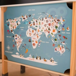 - Keuken met magnetron, oven, vaatwasser, wasmachine en koffiezetapparaat; wasmand; 4 borden; mok; pan; koekenpan; spatel; vork; koksschort en muts; krijtbord; wereldkaart; kaartjes met afvalafbeeldingen voor het sorteren