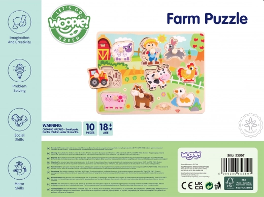 Ontdek de leuke houten inlegpuzzel met boerderijthema van Woopie Green – het ideale eerste puzzelspel voor kleine handjes. De stevige houten plaat en 9 kleurrijke stukken met houten knopjes ondersteunen fijne motoriek, oog-handcoördinatie en herkenning van vormen en dieren. Dankzij de veilige afwerking, afgeronde randen en niet-giftige verf is zorgeloos spelen mogelijk vanaf 18 maanden.