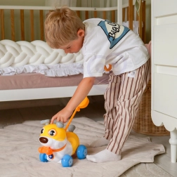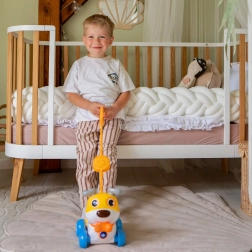 De schattige interactieve hond van het merk WOOPIE is een geweldige metgezel voor de eerste stapjes en voor dagelijks spelen. Dankzij de functie 2-in-1 – duwen en trekken past hij zich gemakkelijk aan het tempo van het kind aan, terwijl hij blaft en vrolijke geluiden maakt. De elastische handgreep zorgt voor soepele bewegingen in alle richtingen en de draaiende oortjes en staart 360° stimuleren nieuwsgierigheid en coördinatie. Er is ook een schattig bot om te “voeren”, wat de fantasie en rollenspel bevordert.