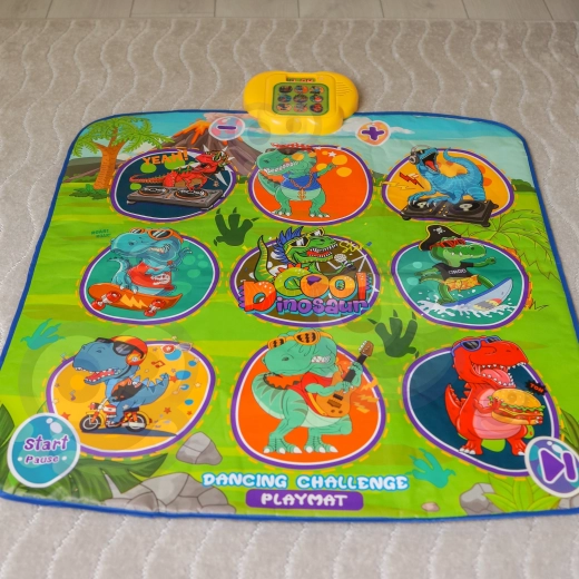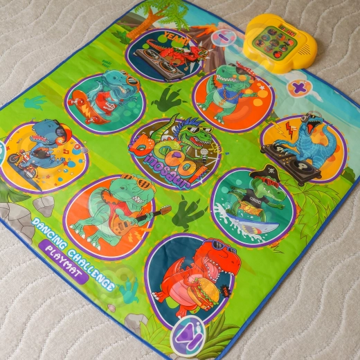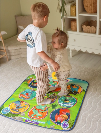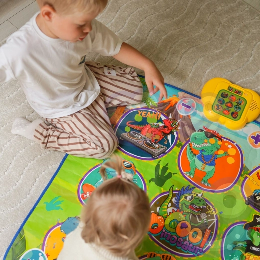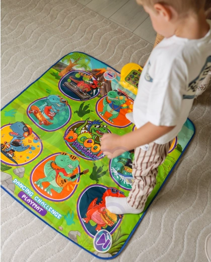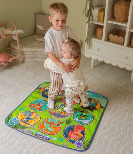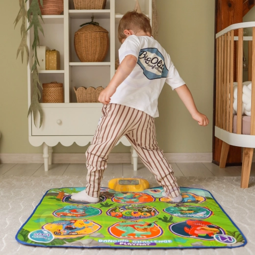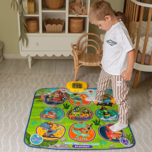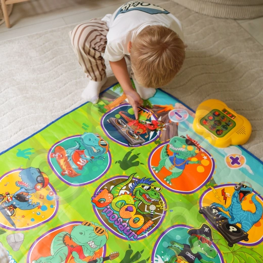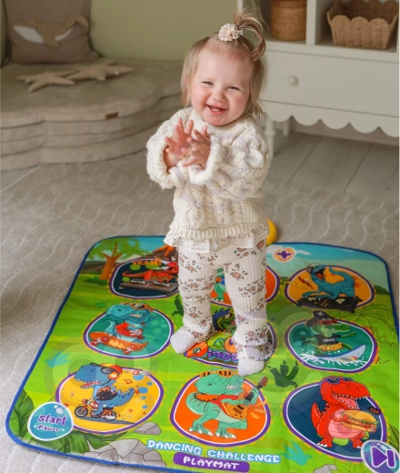De vrolijke dansmat met dinosaurussen motiveert kinderen tot bewegen en interactief leren. Negen grote, kleurrijke vlakken reageren op aanraking en de besturingsmodule zorgt voor stapsgewijze begeleiding, die op speelse wijze coördinatievaardigheden, ritmegevoel en auditieve waarneming ondersteunt. De zachte constructie is prettig om op te stappen en veilig voor dagelijks spel.