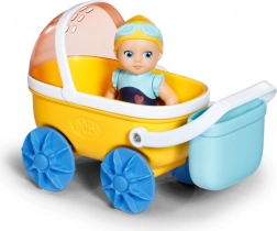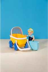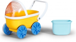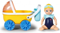 - Gele kinderwagen, blauwe wielen en mandje, pop met blauwe badkleding