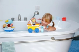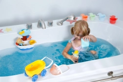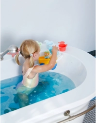 Duurzame kunststof, afgeronde vormen en heldere kleuren stimuleren de zintuigen en de fijne motoriek. De set is ideaal voor bad, kinderzwembad en spelen bij de wastafel en is dankzij het afneembare mandje makkelijk schoon te maken en veelzijdig te gebruiken.