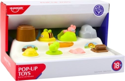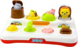 Op het oppervlak van het speelgoed bevinden zich verschillende elementen: een schakelaar, een draaiknop, een schuif en knoppen – elk activeert een ander venstertje waaruit ineens een schattig diertje “tevoorschijn springt”. Het pop-up mechanisme bezorgt kinderen veel plezier en leert hen tegelijk de causale samenhang begrijpen – het kind ziet dat een handeling een specifieke reactie veroorzaakt.