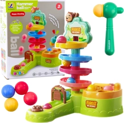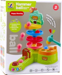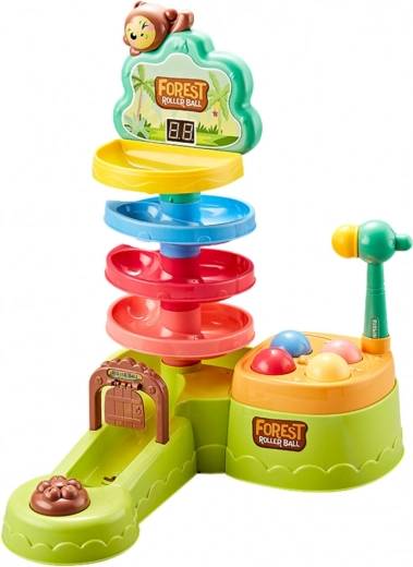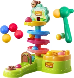 De knikkerbaan is gemaakt van veilige, kleurrijke en duurzame materialen die de aandacht trekken en uitnodigen tot spelen. Begin het spel door een van de vier knikkers bovenaan de baan te plaatsen. Het kind houdt de knikker in beweging met een tik van het hamertje en kijkt hoe deze naar beneden rolt, wat de coördinatie en het begrip van oorzaak en gevolg ontwikkelt.