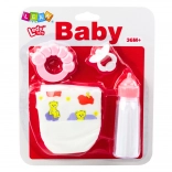 De set bevat een doorzichtige babyfles met witte vulling die melk imiteert, een klassieke speen, een zachte luier versierd met roze motieven en een rammelaar. De compacte afmetingen van deze accessoires zorgen voor een gemakkelijke grip en plezierig spel.
