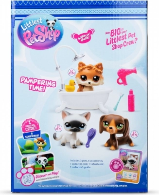 Verwen je huisdiertjes met luxe verzorging met de Littlest Pet Shop SPA-set! Bevat 3 schattige figuurtjes (teckel, Siamese kat, pomeriaan) en kleurrijke spa-accessoires voor spel en creatieve verhalen. Inclusief een verzamelkaart en een virtuele code om digitale verrassingen in de wereld van LITTLES PET SHOP te ontgrendelen.