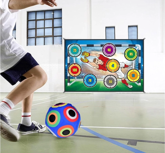 De voetbalset met doelbord is ontworpen om veilig en kindvriendelijk te zijn. Hij is gemaakt van duurzame, niet-giftige materialen die zacht en veilig zijn. Het kleurrijke en aantrekkelijke doelbord trekt de aandacht van kinderen en moedigt hen aan om te oefenen. De lichtgevende bal brengt extra verrassing in het spel; hij licht op tijdens het gooien, wat het plezier vergroot. Het spel is eenvoudig in gebruik; kinderen kunnen zelf proberen de bal door de openingen te mikken, waardoor nauwkeurigheid en concentratie worden ontwikkeld. Bovendien stimuleert het de motorische ontwikkeling; gooien, richten en vangen helpen de fijne motoriek en de hand-oogcoördinatie te trainen.