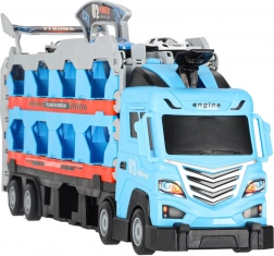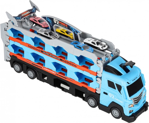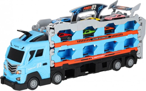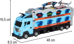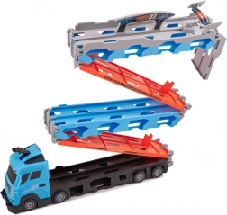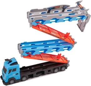 Deze multifunctionele set combineert een autotransporter en een lange racebaan in één. Uitgeklapt wordt de truck een dubbele baan van 210 cm, waarop kinderen spannende duels kunnen houden en records kunnen meten.