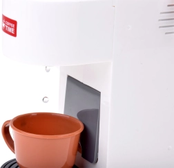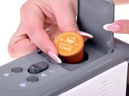 De koffiemachine laat je water in de kopjes schenken en simuleert het zetten van koffie, inclusief de keuze van het dranktype – een perfecte ervaring zoals in een echt café.