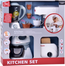 Ontdek een complete set kinderkeukenapparaten in een elegante witte kleur, waarmee kinderen volwassenen kunnen nadoen en hun creativiteit en sociale vaardigheden kunnen ontwikkelen. De set bevat een mixer, koffiemachine, broodrooster en staande mixer met realistische licht- en geluidseffecten, een pop-upfunctie voor toast en de mogelijkheid om echt water te schenken in kopjes. De ideale aanvulling voor elke kinderkeuken.