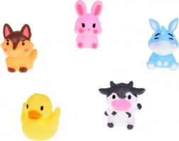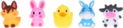 De set bevat: 5 rubberen boerderijdierenfiguren, elk in een andere kleur (konijn, koe, hond, eend, ezel) met een afmeting van ongeveer 5 cm x 4 cm x 4 cm. Het speelgoed is gemaakt van veilige, rubberen materialen die vriendelijk zijn voor de gevoelige kinderhuid. Makkelijk te onderhouden en zeer duurzaam, waardoor ze lang meegaan.