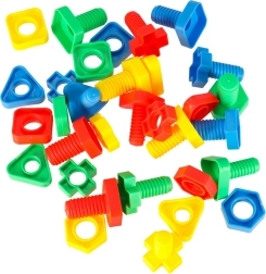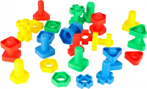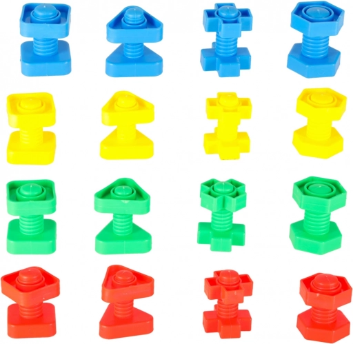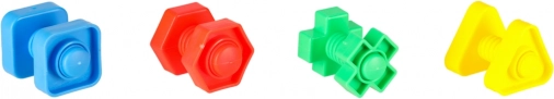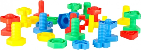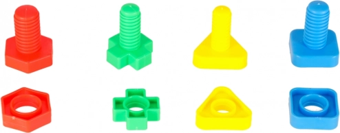 De afzonderlijke schroeven en moeren hebben verschillende vormen die correct aan elkaar gekoppeld moeten worden. Dankzij het eenvoudige principe is de bouwset geschikt voor kleuters en ondersteunt hij uitstekend de ruimtelijke verbeelding en het geduld.