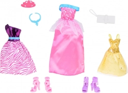 De set modieuze kleding ANLILY is perfect voor kinderen die van stijl en ontwerpen houden. Het bevat drie verschillende jurken - elk met een uniek ontwerp en kleur, twee elegante paar hakken, een stijlvolle tas, een blauwe ketting en een delicate kroon die ideaal is voor elk klein prinsesje.