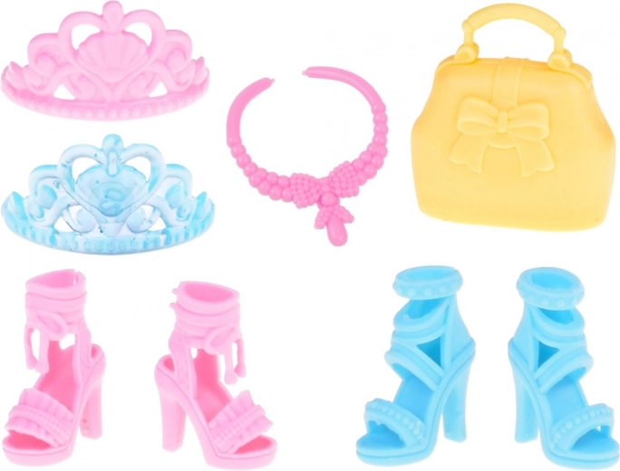 Twee elegante paar hakschoenen voegen charme en stijl toe aan de algehele look. Accessoires zoals een stijlvolle handtas, een roze ketting en twee kroontjes zijn perfect voor elke kleine prinses.