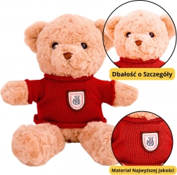 De beer in een gebreide trui met een geborduurde patch op de borst ziet er uiterst stijlvol uit — hij dient niet alleen als knuffel, maar ook als decoratie. Het truitje geeft hem karakter en maakt de mascotte nog opvallender.