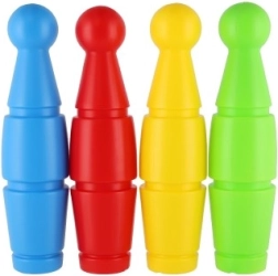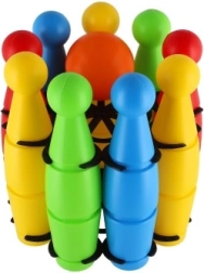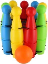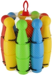 Een leuke set voor kleine bowlers met 9 gekleurde kunststof kegels en een kunststof bal. Licht en veilig speelgoed voor binnen en in de tuin dat helpt bij het ontwikkelen van fijne motoriek, concentratie, nauwkeurigheid en fair play. De kegels zijn 24 cm hoog en de hele set is praktisch verpakt in een net.