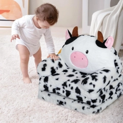 Betoverend ontwerp met kenmerkende zwart-witte vlekken, een vriendelijke gezicht, roze neus, uitstekende oren en zachte horens trekt onmiddellijk de aandacht van kinderen en brengt een vrolijke en gezellige sfeer naar het interieur. Het koeienmotief past perfect bij de decoratie van de kinderkamer en wordt een functionele aanvulling ervan.