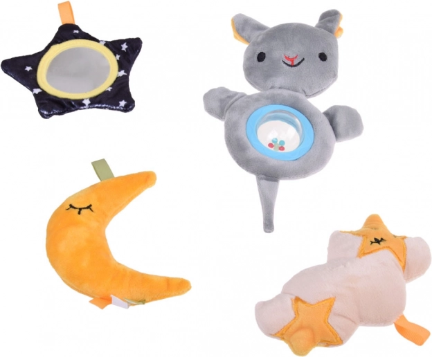 De set omvat twee bogen waaraan vier schattige speeltjes kunnen worden opgehangen, speciaal ontwikkeld voor de visuele, tactiele en auditieve ontwikkeling. De speeltjes nodigen uit tot kijken, grijpen en prikkelen de zintuigen van je baby op een positieve manier: