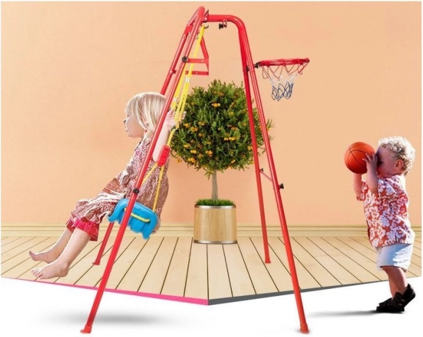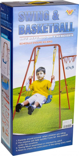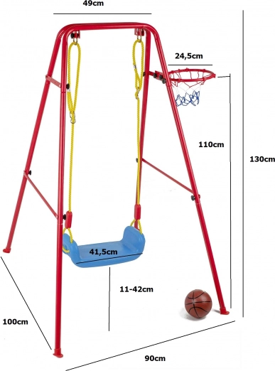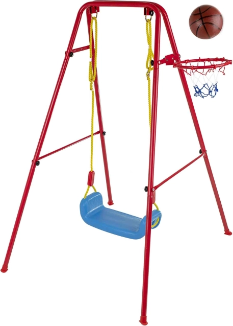 Deze veelzijdige tuinsschommel combineert het geliefde schommelen met basketbalplezier. Het stabiele metalen frame met buizen van circa 2,5 cm en het sterke touw dragen de brede kunststof zitting (ca. 43 × 25,5 cm) voor comfortabel en veilig gebruik. Inclusief basketbalring die eenvoudig op het frame kan worden bevestigd, plus een mini bal en pompje voor direct spelen.