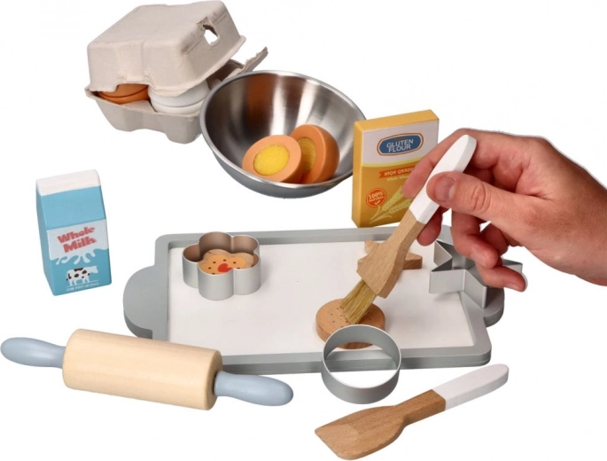 De deegroller, garde, kwastjes, uitsteekvormpjes en kom laten kinderen echt bakken nabootsen en het hanteren van gereedschap oefenen.