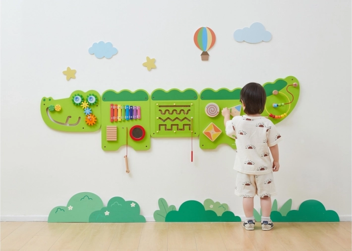 Dit leuke houten wandtableau in de vorm van een krokodil biedt kinderen vanaf 18 maanden uren aan zintuiglijk ontdekken en fijne-motoriektraining. Het bevat een xylofoon, tandwielen, een doolhof, schuif- en draaielementen en kralen op een draad, die oog-handcoördinatie, logisch denken en muzikale beleving stimuleren. Door de wandmontage bespaart het ruimte en is het ideaal voor kinderkamers, kinderopvang en speelhoeken.